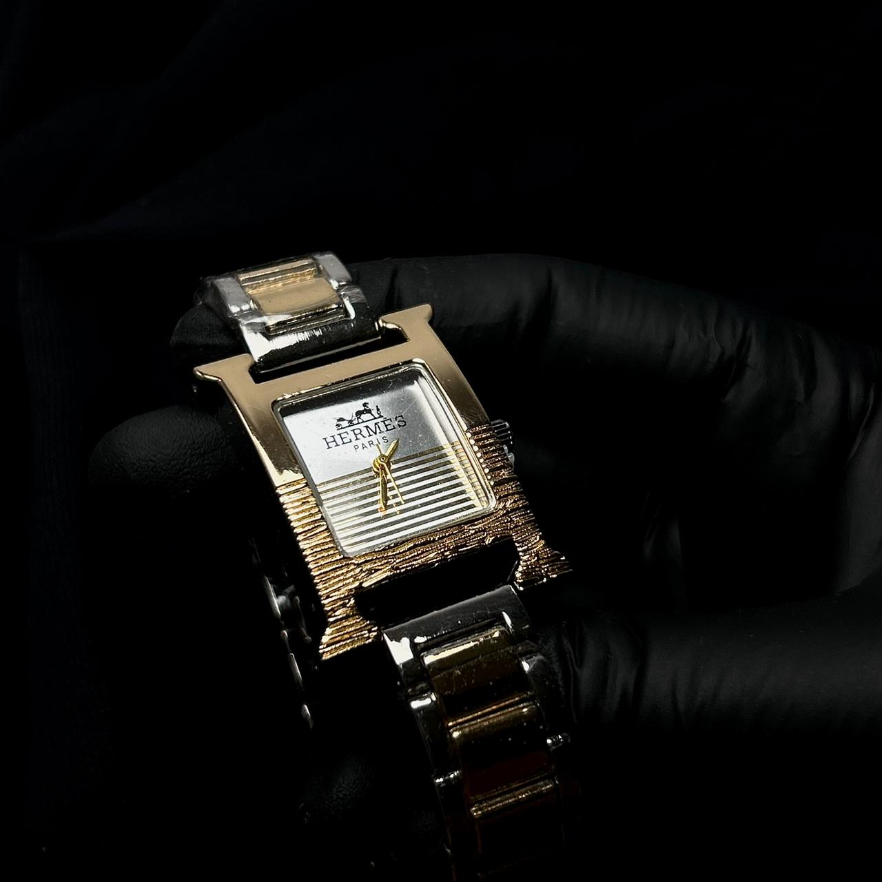 The Hermès Paris Two Tone Edition embodies pure luxury and refinement. Its architectural rectangular case showcases a textured frame that catches the light beautifully, while the champagne-gold dial with horizontal lines enhances its elegant depth. The polished gold bracelet completes this timeless masterpiece — a statement of grace for women with elevated taste.