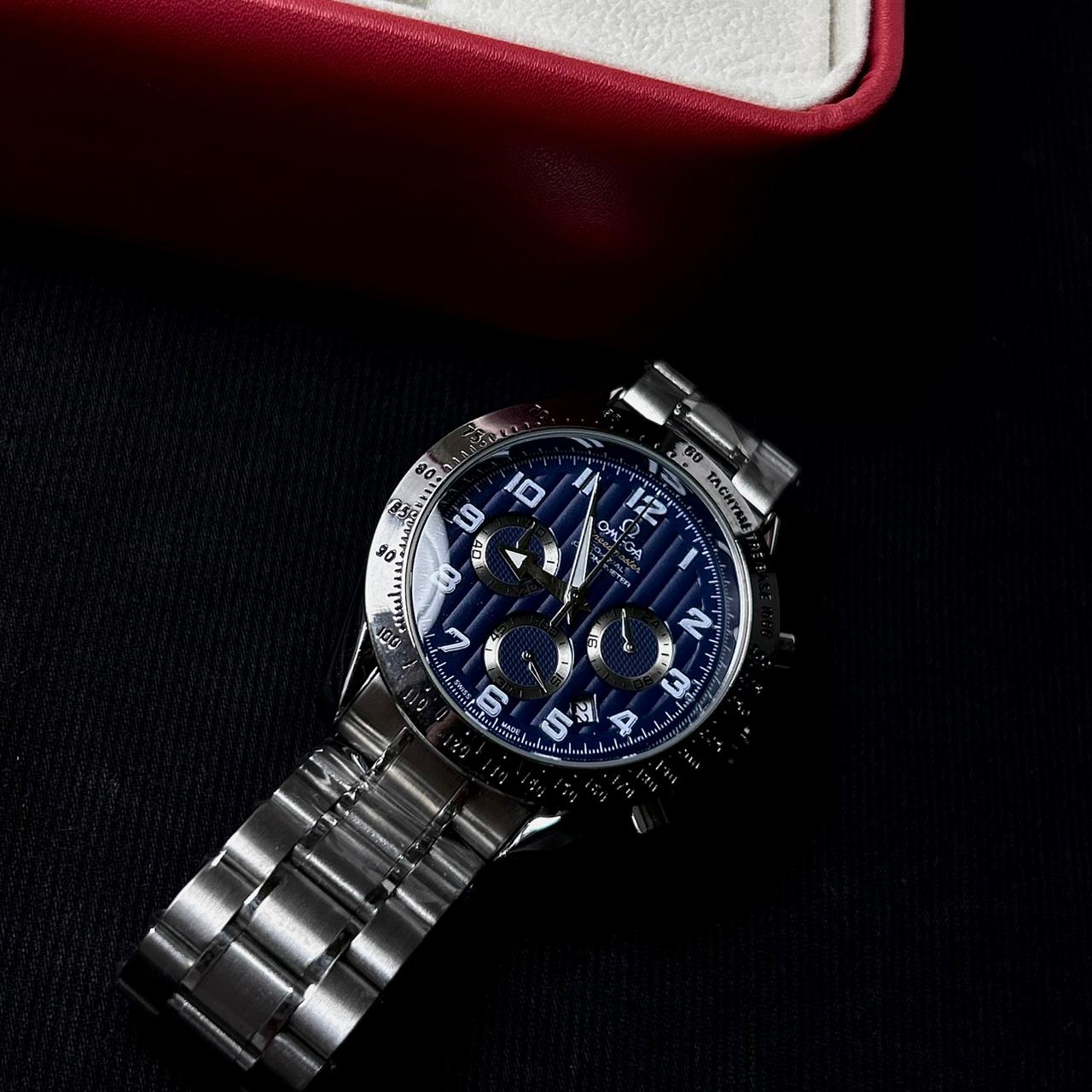 Elegant yet dynamic, this Omega Speedmaster homage blends a polished stainless steel case and bracelet with a deep blue dial enriched by vertical textured detailing. Silver Arabic numerals and dark chronograph subdials add refined contrast, while the tachymeter bezel reinforces its sporty sophistication. Designed for men who appreciate both precision and prestige, this timepiece embodies timeless versatility and bold presence.