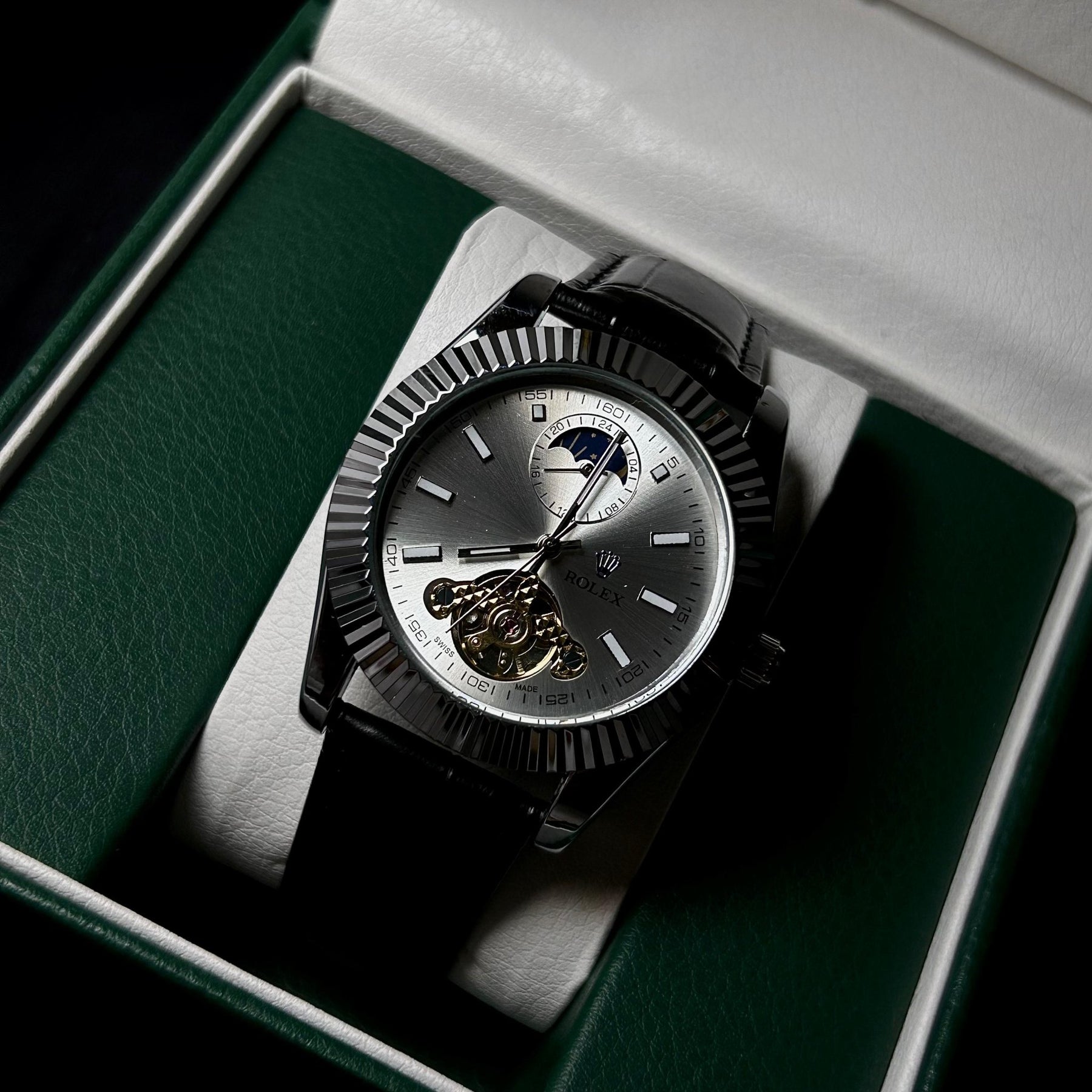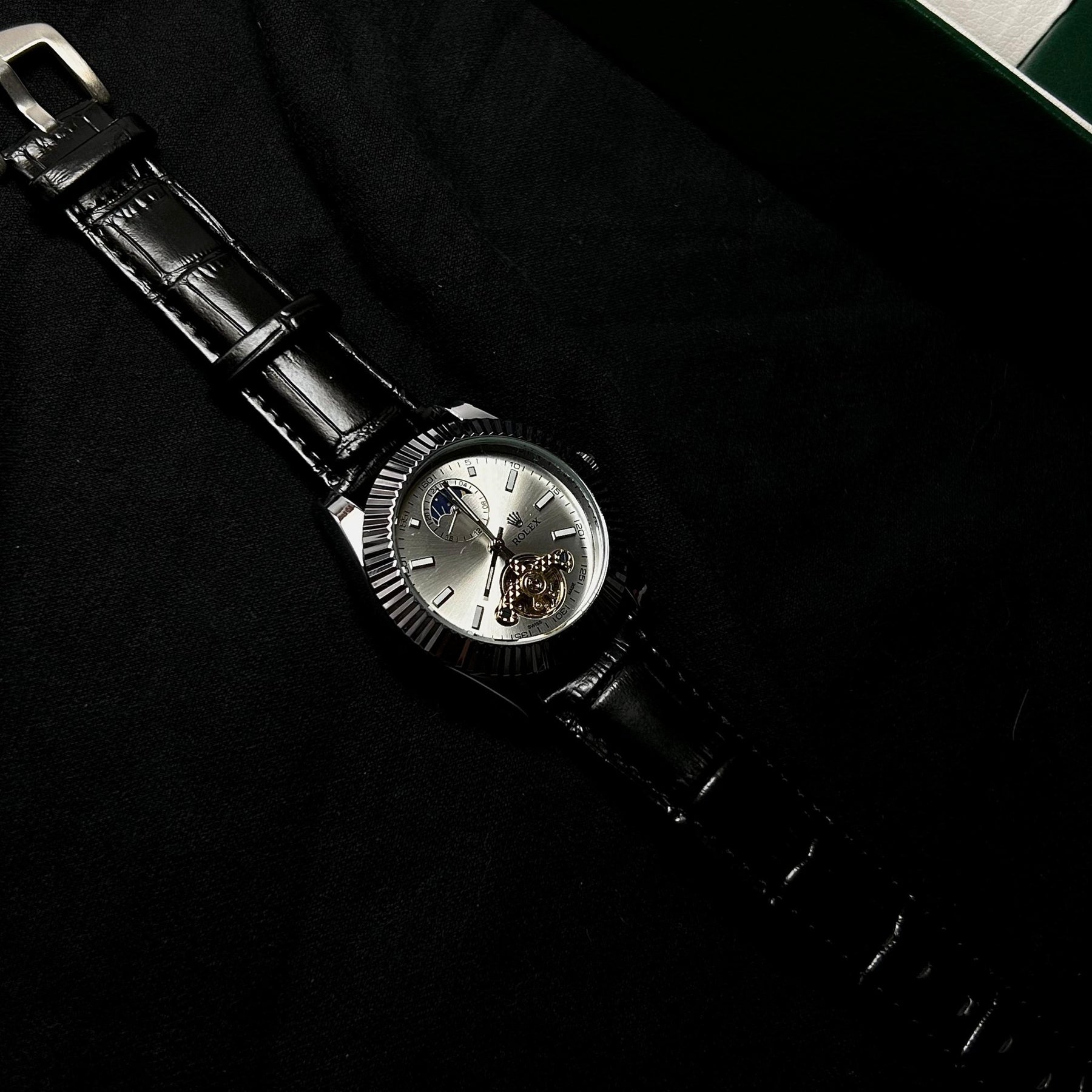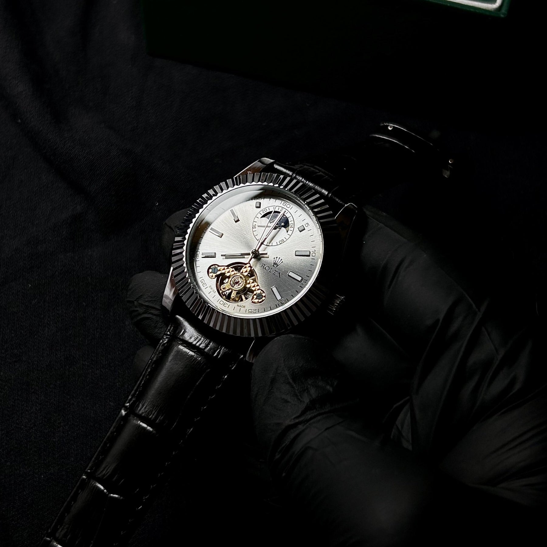A bold reinterpretation of classic luxury, this Hybrid edition fuses elegance with modern horology. The silver dial with sunburst finish is elevated by a moonphase display and open-heart mechanism at 6 o’clock, framed by a fluted bezel that adds timeless sophistication. Paired with a sleek black leather strap, it’s a statement of refined taste.
