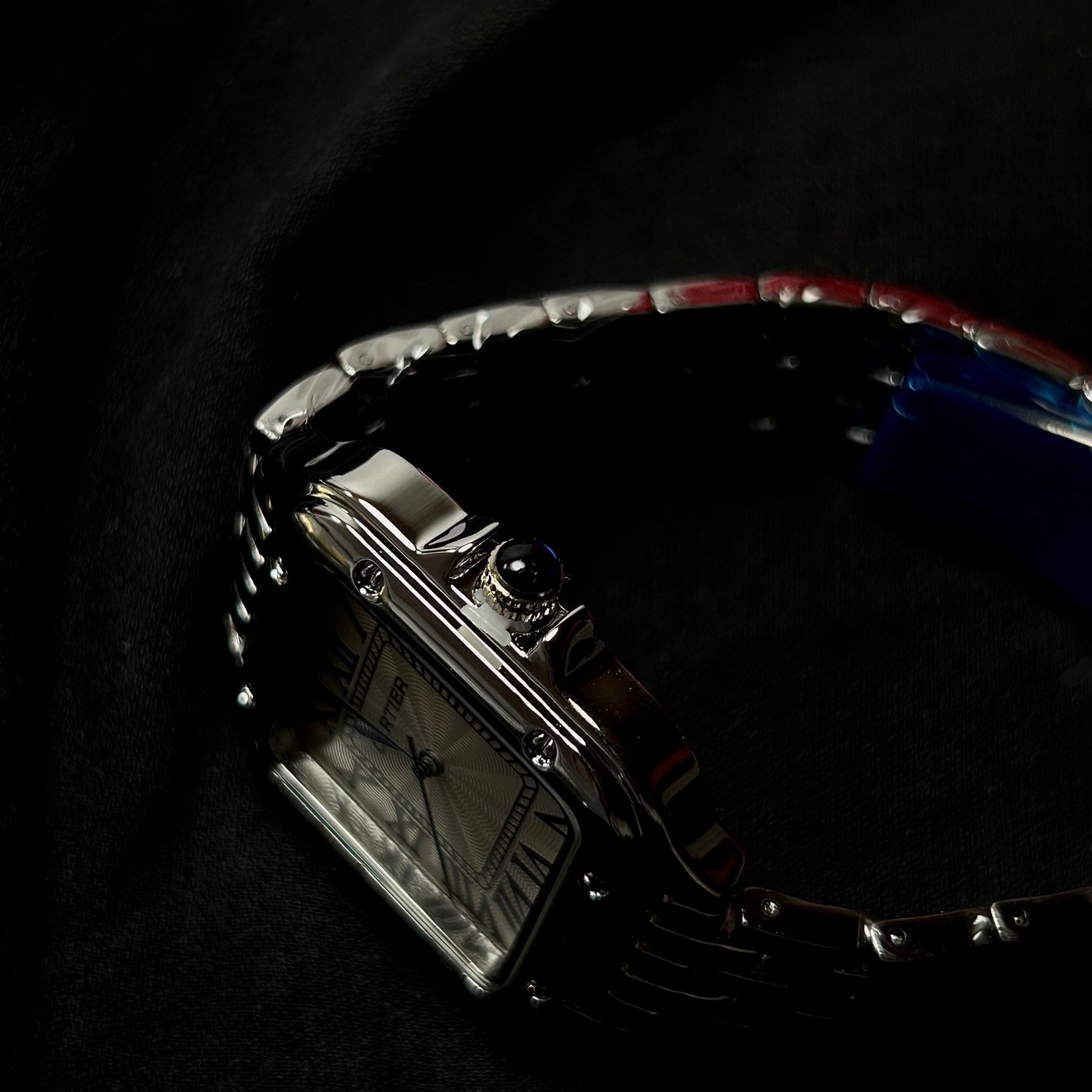 An elegant icon of timeless sophistication, this Cartier Panthère homage features a polished stainless steel case and bracelet, paired with a refined silver-white dial adorned with black Roman numerals. Its square bezel and signature blue hands complete the classic Cartier aesthetic, making it a versatile piece for both men and women.