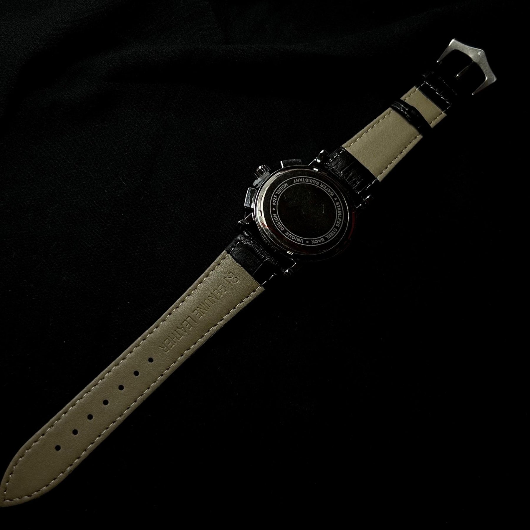 Elegant and timeless, this Drive de Cartier homage embodies classic sophistication with a bold contemporary edge. The polished silver stainless steel case frames a deep black guilloché dial adorned with Roman numeral hour markers and multiple subdials for refined functionality. Paired with a sleek black leather strap, it offers a perfect balance of tradition and modern luxury.