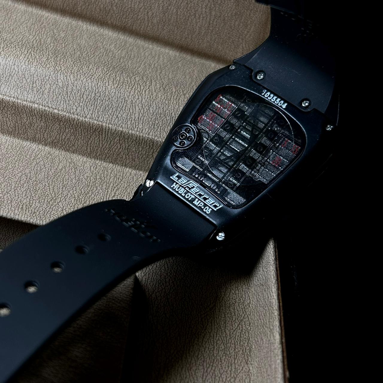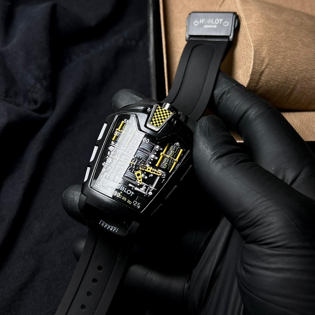 A bold fusion of racing spirit and stealth luxury, the Hublot LaFerrari Style in Black Yellow delivers a striking and energetic wrist presence. The open-worked dial reveals a detailed mechanical-inspired structure enhanced by vivid yellow accents, creating a powerful contrast against the deep black case. Designed for those who embrace performance-driven aesthetics and statement design, this timepiece blends motorsport inspiration, innovation, and modern luxury into one commanding silhouette.