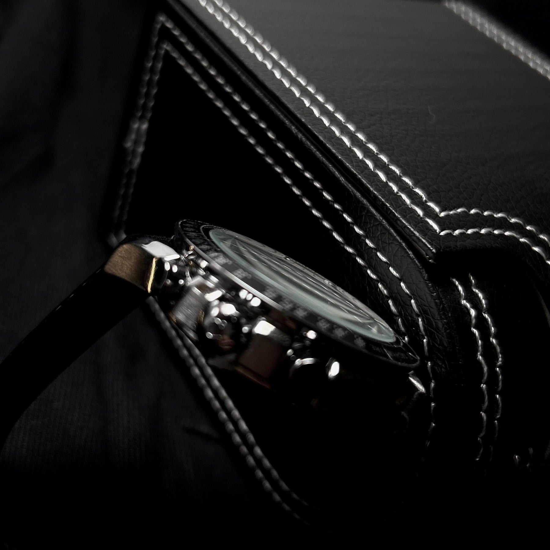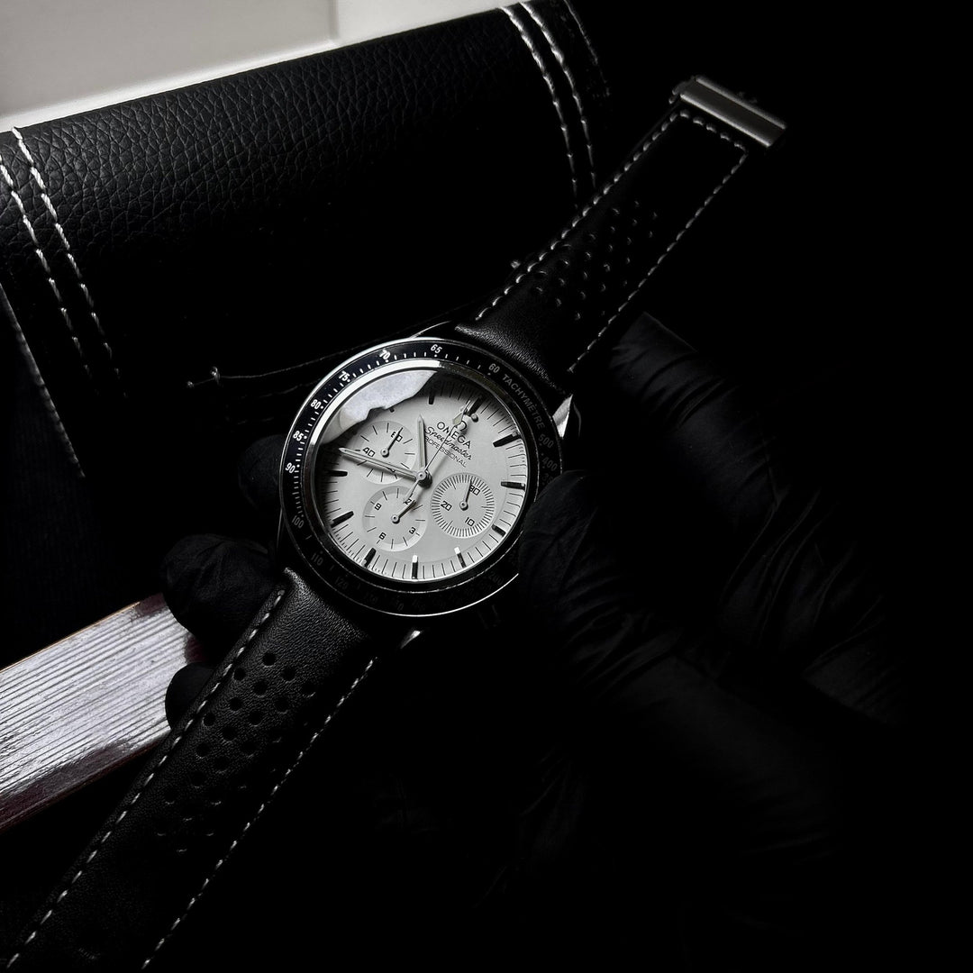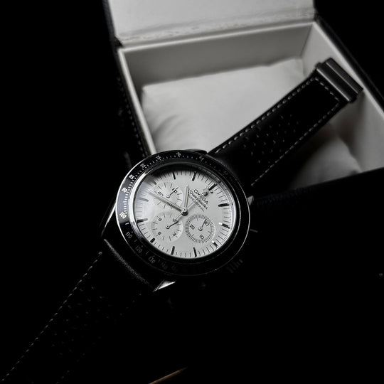 A refined tribute to the iconic Omega Speedmaster “Moonwatch,” this timepiece captures the spirit of space-age heritage with a crisp white dial and sleek black tachymeter bezel. The chronograph layout with three subdials reflects precision engineering, while the perforated black leather strap with white stitching adds a sporty, vintage feel. Perfect for those who appreciate legacy, function, and timeless design.