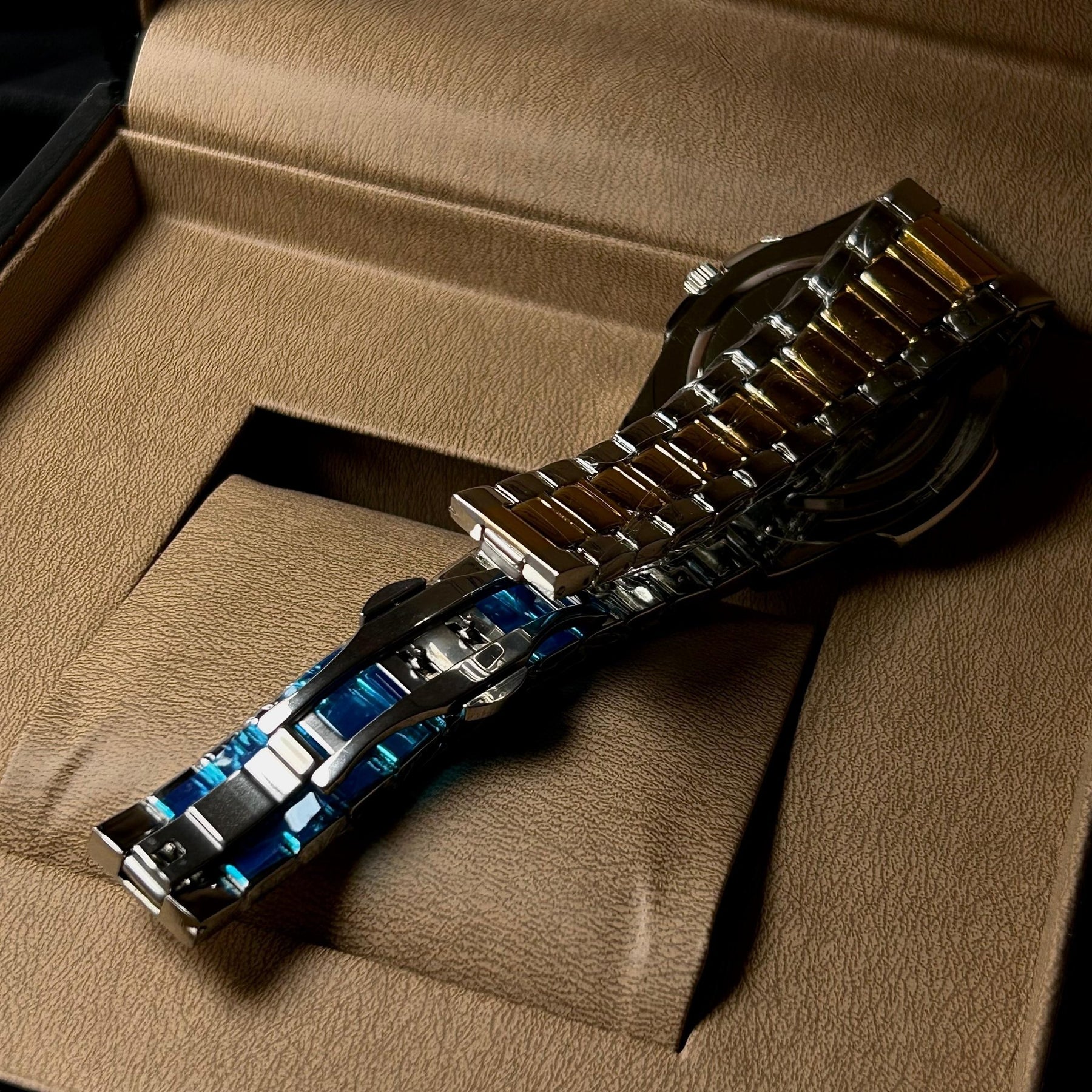 Elegant and timeless, this Patek Philippe Nautilus homage features a polished silver stainless steel case enriched with a gold-tone bezel and matching center links on the bracelet. The silver-white horizontal-striped dial is complemented by gold markers and hands, alongside a date display—offering a refined two-tone aesthetic that blends prestige with modern style.