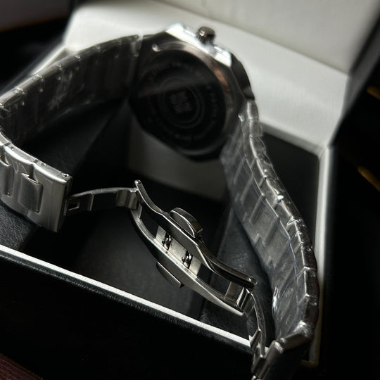 A refined execution of minimalism and masculine edge, this homage watch showcases a bold square silhouette with a matte-finished silver bezel and full stainless steel construction. The horizontal black dial features crisp white hour markers and a compact date window, creating a sharp contrast for easy readability and modern appeal.