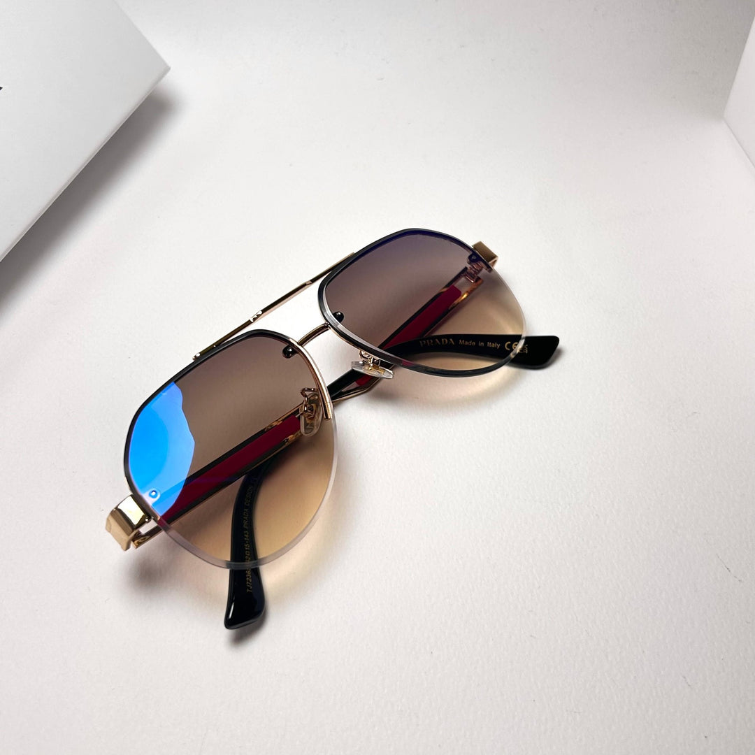 Temple Design: Polished gold temples with red Prada Linea Rossa logo insert