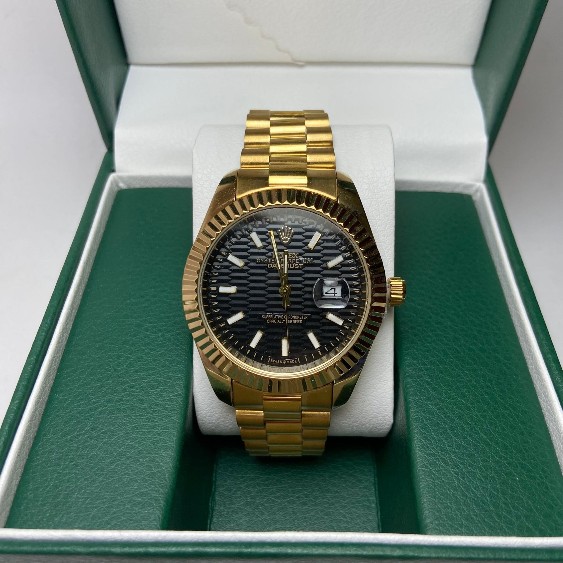 This timepiece offers a classic and elegant design inspired by the Rolex Datejust. Featuring a gold-tone finish and a striking black dial with a textured pattern, this watch offers a luxurious and sophisticated look. Powered by a precise quartz movement for reliable timekeeping.